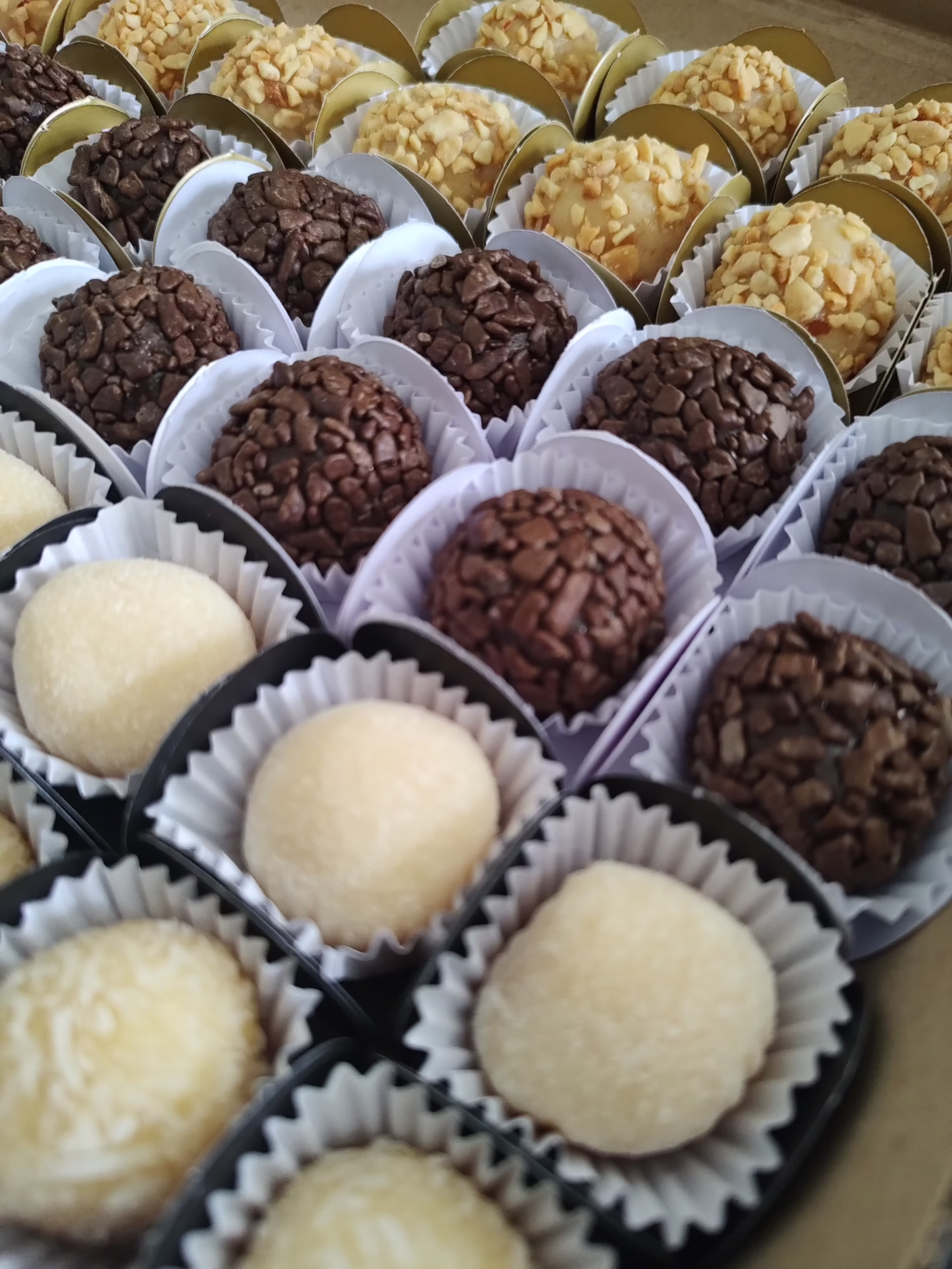 Recheios: Brigadeiro Tradicional de Chocolate, Brigadeiro Branco, Brigadeiro Branco com Geleia de Morango, Brigadeiro Branco com Abacaxi, Coco e Doce de Leite feito com Leite condensado Cozido.